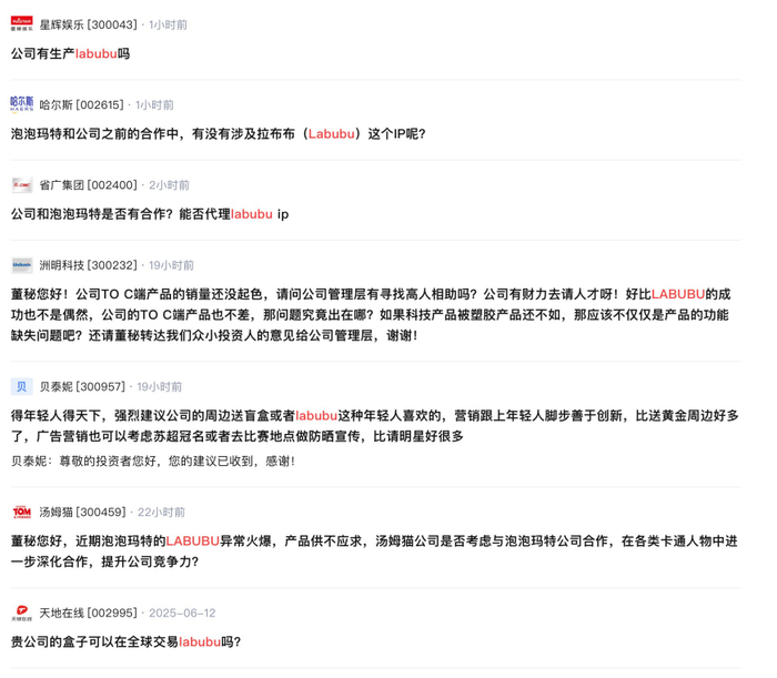 据记者不完全统计,截至6月13日中午,投资者互动平台上,已有星辉娱乐、奥飞娱乐、天地在线、省广集团等20余家上市公司被问到Labubu相关的内容。