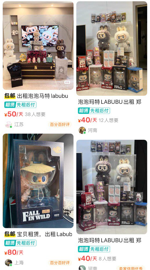 随着Labubu的热度持续攀升、供不应求,有一批用户已经发现新商机——在闲鱼出租Labubu系列公仔,有多位卖家提供实体公仔的出租服务,主要用于拍照、社交展示、婚宴布置等场景。