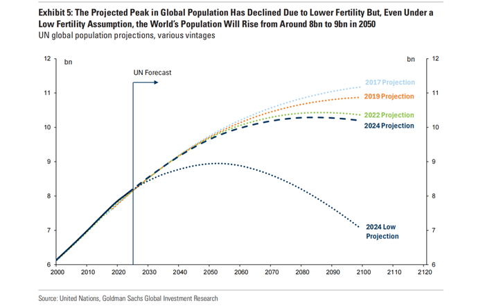 受寿命延长和少子化趋势影响,全球人口增速正在放缓。联合国最新预测显示,本世纪全球人口峰值将低于此前预期:2017年曾估计全球人口将由当前的82亿增至本世纪末逾110亿并持续上升,如今则预期在2075年前后约103亿人达到顶峰,随后逐步下降。