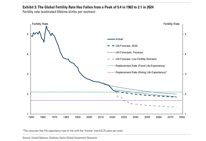与长寿时代相伴的,是全球范围内生育率的下滑。20世纪中期以来,全球总和生育率从1963年的5.4降至1975年的4.1,如今仅约2.1,恰好处于代际更替的临界水平。