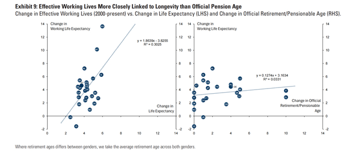 这种延迟退休(不一定是被动延迟,更是主动选择)的现象,并非完全依赖政策驱动。很多国家并未大幅提高法定退休年龄,劳动力参与率的提升更多是民众对更长健康寿命作出的自发调整。研究发现,各国有效工作年限的延长幅度与本国寿命增长更为相关,而与官方退休年龄政策变动的相关性反而不明显。这意味着,即便没有强制性的制度改变,长寿本身正在塑造新的工作文化:人们愿意也有能力工作更长时间。