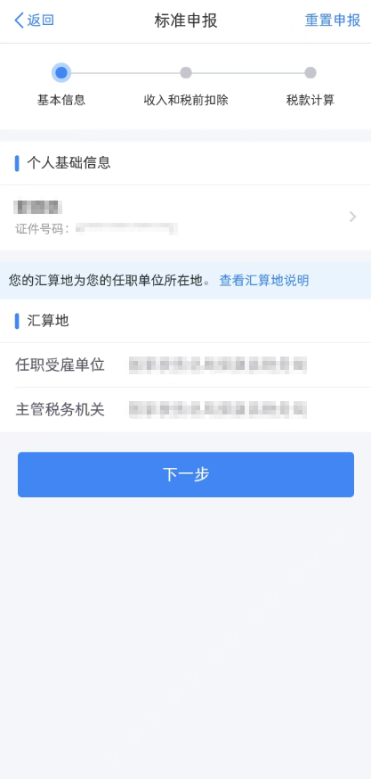 第一步:打开个人所得税APP并登录,点击首页【2024综合所得年度汇算】专题页,点击【开始申报】,阅读提示信息后,点击【我已阅读并知晓】进入申报界面,仔细核对个人基础信息,确认无误后,点击【下一步】。