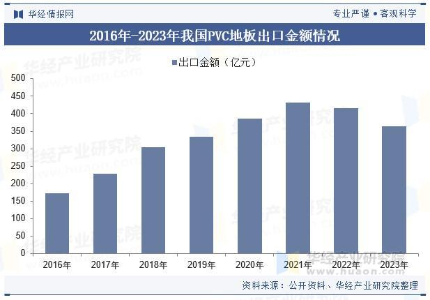 PVC地板属于建筑装修装饰消费品,其行业市场需求受房地产行业发展、二次装修市场以及消费升级等因素影响。欧美等主要发达国家对PVC地板的接受程度较高,已成为PVC地板的主要消费市场。2016年至2023年我国出口PVC地板金额从172.60亿元增长到364.19亿元,年均复合增长率达11.26%。