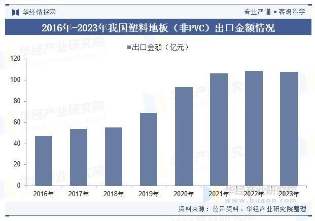 我国凭借生产成本及产业链优势,已成为塑料地板的主要生产地区。受欧美地区塑料地板进口需求的持续快速增长,我国塑料地板出口规模亦随之快速增长。2016年至2023年我国塑料地板从47.13亿元增长至107.75亿元,年均复合增长率达12.54%。