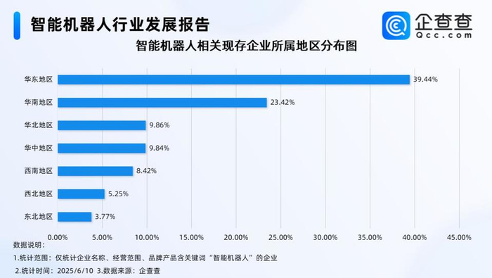 企查查数据显示,从地区分布来看,国内智能机器人相关现存企业主要分布在华东地区、华南地区,分别占比39.44%、23.42%,其次为华北地区、华中地区和西南地区。