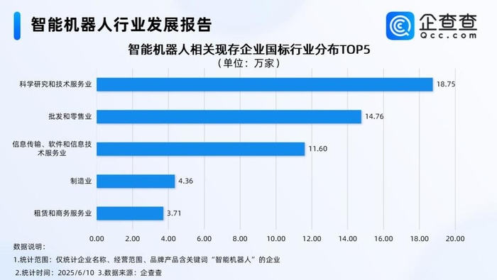 企查查数据显示,从国标行业分布来看,归属科学研究和技术服务业的相关企业最多,达18.75万家,占比超30%。其次为批发和零售业,信息传输、软件和信息技术服务业和制造业,分别达14.76万家、11.6万家、4.36万家。这从一个侧面说明,智能机器人产业正处于技术研发阶段,还未进入大规模商业应用阶段。