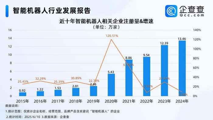 企查查数据显示,截至目前,国内智能机器人相关现存企业达57.79万家,从注册量来看,近十年国内智能机器人相关企业注册量呈逐年上升趋势,2020年注册量同比增长120.51%至5.43万家,达近十年注册量增速峰值.2023年全年注册量迈过10万家增量;2024年注册量达13.46万家,同比增长8.68%。