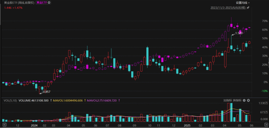 以黄金股ETF(517520.SH)和黄金ETF(518880.SH)的历史走势为例,自2023年11月至今,黄金ETF的涨幅为65.7%,最大回撤为6.08%。