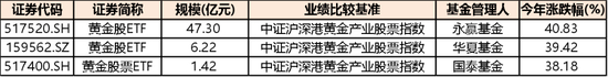 截至昨日,永赢基金的黄金股ETF(517520.SH)以40.8%的涨幅领跑,管理规模也最大,达47亿。华夏、国泰等跟踪相同指数的黄金股ETF的年内涨幅均超过30%,而跟踪黄金现货的黄金ETF整体涨幅维持在28%左右。