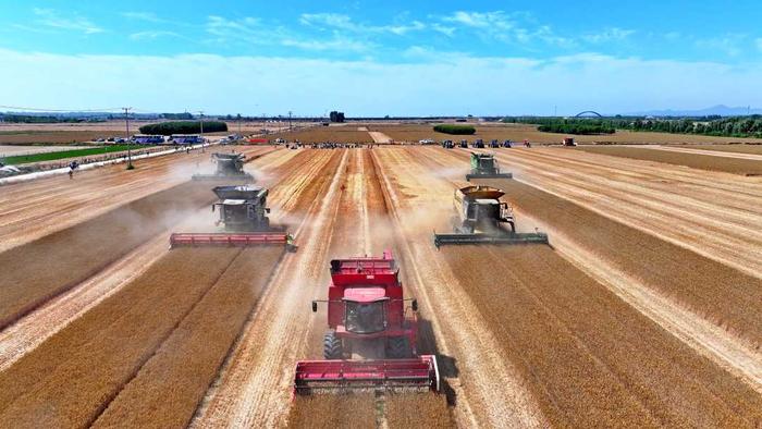 山东青岛:农机逐金浪 滚动播报 2025.06.13 18:16 转自:经济日报 6月12日,山东省青岛市西海岸新区大场镇的市级绿色增粮先行区种植基地,小麦联合收割机在麦田中穿梭收获。宋林继摄(中经视觉)