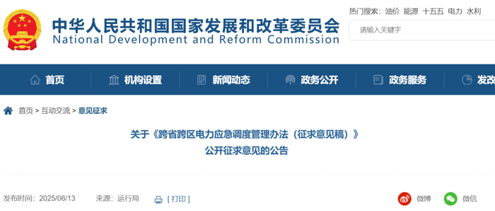 6月13日,国家发改委发布《跨省跨区电力应急调度管理办法(征求意见稿)》,向社会公开征求意见。