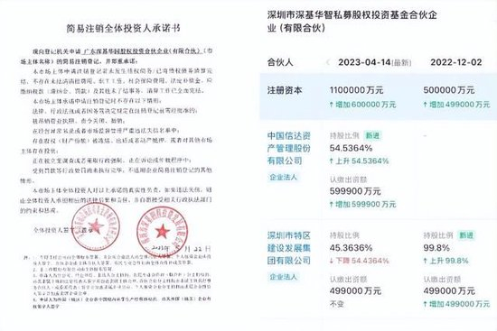2023年4月,深基华智规模扩大至110亿,中国信达被引入并持有54.54%基金份额,对应的认缴出资额约60亿;特区建发认缴规模不变。