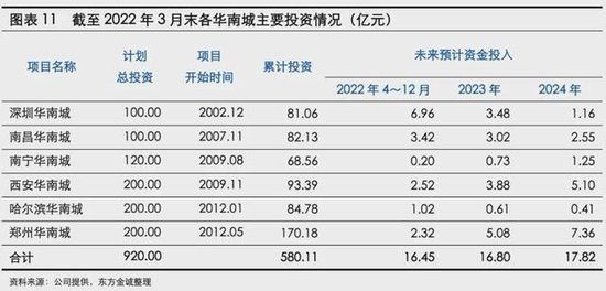 实际规模虽不及预期,西安华南城2018年之后的投资额却大幅飙升:2018年末,其累计投资以63.59亿在财报显示的6大项目中倒数第二,至2022年3月就升至第二,三年增加近30亿投资。