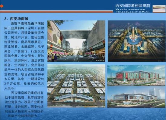 西安华南城位于西安国际港务区内,后者2008年成立,目标为建设中国第一个不沿江、不沿海、不沿边的国际陆港。西安华南城早期宏大规划从各个方面都堪称为港务区量身定做。