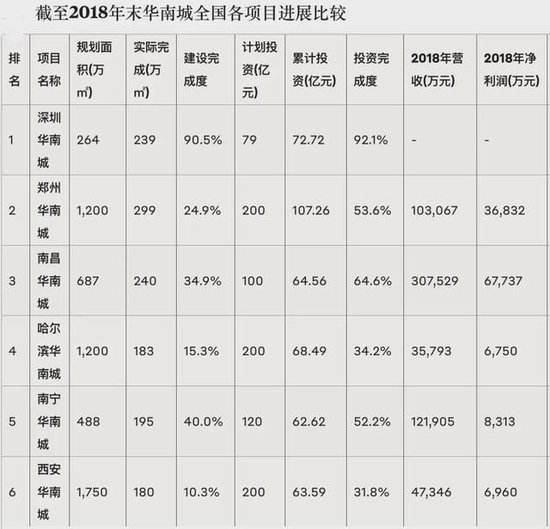 比如,至2018年末,西安华南城建成面积180万平米,无论是数据绝对值,还是对比规划的实现率,在6个项目中均为垫底。对比2012年4月成立的郑州华南城,至2018年末实际完成建设面积299万平米,启动时间比西安晚两年半,建设多完成近120万平米。