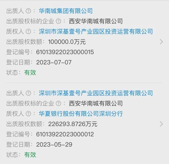 2023年5月29日,深基壹号又将刚刚交割到手的西安华南城近7成股权质押给华夏银行,融资22.6亿;一个多月后,华南城将持有的其余约3成西安华南城股权也进行质押,从华夏银行融资10亿。