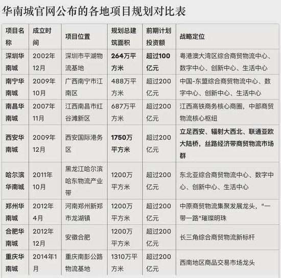 华南城的最早项目是2002年开始的深圳华南城,2007年末启动全国布局,7年落地7个项目,目前共运营开发8个华南城。其中,合肥、重庆为代管模式,华南城集团通过子公司持股而非直接控股。八大项目当中,规划最宏大当属西安华南城。