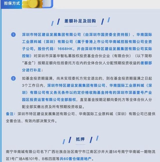 相关公告显示,在引入中国信达入股基金时,各方曾签署“差额补足”协议:若基金无法向投资人(此处即中国信达)分配预期收益,特区建发与华南城需补足差额;若投资期满后中国信达未能退出,两家公司则需按约定价格强制回购股权,确保中国信达收回本息。为此,南宁华南城60套仓储物业被抵押,为这一“安全承诺”提供担保。