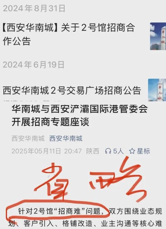 2024年至今,西安华南城多次对外发布关于其“2号交易广场”的招商公告,但应者寥寥。截至目前,外界可见的各种场合频频被提及的一个关键词唯有“招商难”。
