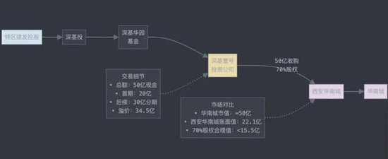 2022年12月,华南城宣布“喜提”50亿注资,具体为:特区建发控股子公司深圳市基础设施投资基金管理有限公司(简称“深基投”)旗下新设一家基金:广东深基华园股权投资合伙企业(简称“深基华园”),后者再新设子公司“深圳市深基壹号产业园区投资运营有限公司”(简称深基壹号)”以50亿人民币认购西安华南城约7成股权。