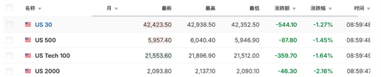 - 美国三大股指期货跌超1%,标普500指数期货跌幅扩大至2%。