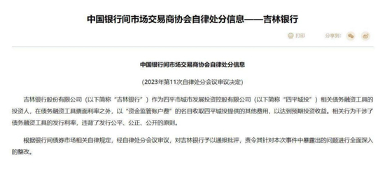 交易商协会2023年第11次自律处分会议审议决定显示,吉林银行作为四平市城市发展投资控股有限公司相关债务融资工具的投资人,在债务融资工具票面利率之外,以“资金监管账户费”的名目收取四平城投提供的其他费用,以达到预期投资收益。相关行为干涉了债务融资工具的发行利率,违背了发行公平、公正、公开的原则,被予以通报批评,并被责令对本次事件中暴露出的问题进行全面深入的整改。