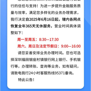 上述公告称,为进一步提升金融服务质量与效率,满足客户多样化的业务办理需求,深圳福田银座村镇银行决定自2025年6月16日起,辖内各网点恢复全年365天无休服务,营业时间具体调整为周一至周五:8:30-17:30,周六、周日及法定节假日:9:00-16:00。