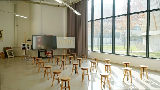 创艺中心位于学校建筑群东北向,是由多个空间组成的,集美术培训、艺术工作室、名师工作室、艺术展厅、学术交流厅于一体的艺术综合体,将艺术人才培养、艺术创作、艺术展示、美育活动融汇互通。