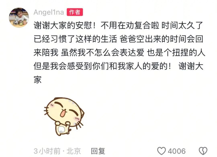 不过,几小时后,甜馨回应网友“求复合”的期待,“谢谢大家的安慰!不用再劝复合啦,时间太久了,已经习惯了这样的生活,爸爸空出来的时间会回来陪我,虽然我不怎么会表达爱,也是个扭捏的人,但是我会感受到你们和我家人的爱的。”