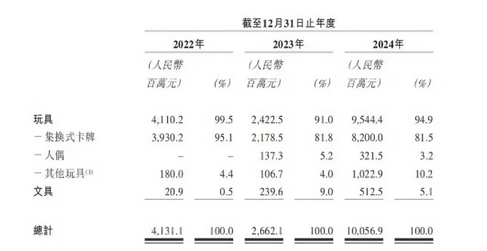 撑起这门生意的,几乎全靠卡牌。2024年,卡游的卡牌业务占总收入超过9成。相比之下,公司尝试拓展的文具、人偶等其他业务则显得微不足道。