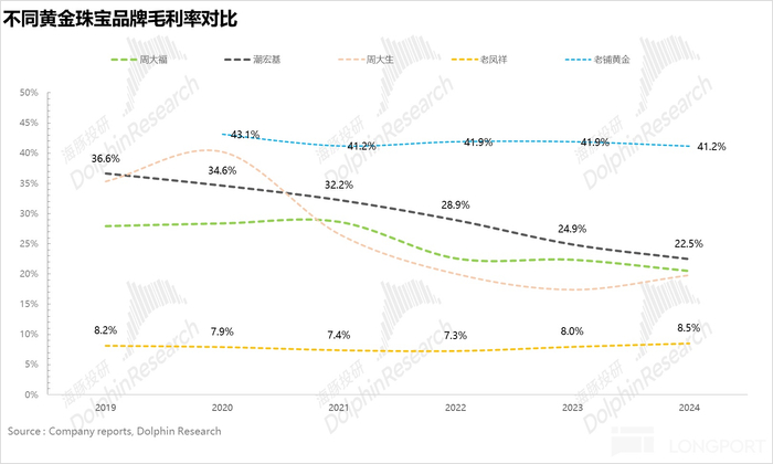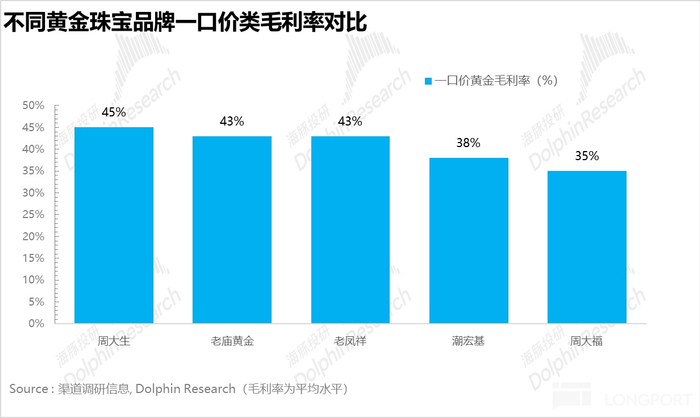 这种定价方法下,换算成克重,至少是黄金基准价的 1-2 倍以上,反映到产品毛利率上,从下图可以看到,各品牌一口价黄金毛利率普遍在 35% 以上,远高于克重计价的黄金饰品。
