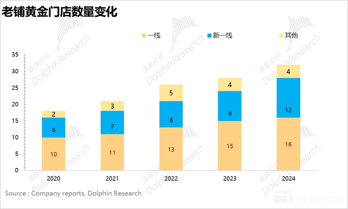 而老铺的独特之处在于从一开始就全部采用直营模式进行精细化管理,严控门店的扩张,过去 5 年,老铺的门店数量仅从 18 家增长到 36 家,且基本都开在一线、新一线的 SKP、万象城等顶奢商场,与 LV、爱马仕做邻居。