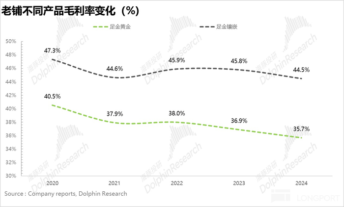 从整体毛利率上看,由于过去两年金价的快速上涨,在其他竞品毛利率逐步下滑之时,老铺的毛利率稳定在 40% 左右。