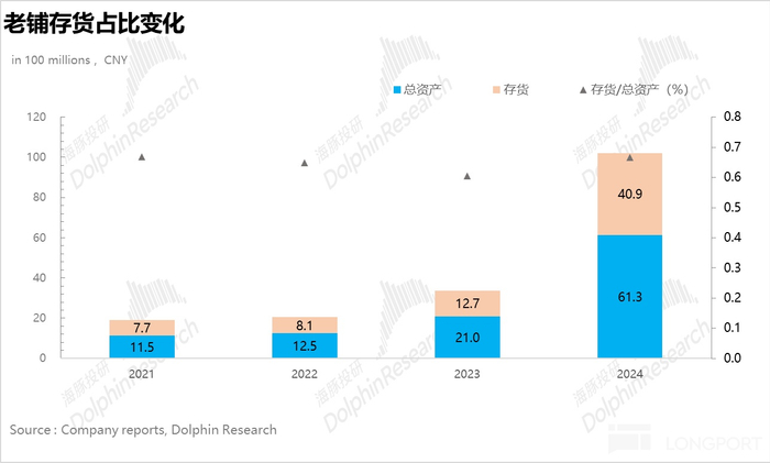 另外一个真正的原因是,虽然海豚君说它减弱了金饰品的投资保值属性,但这个属性因为存货占比太高(占总资产比例近 70%),仍然存在,这也意味着老铺无法真正意义上脱离黄金的价格周期,所以当老铺的估值向奢侈品看齐的时候,基本就是估值高点。