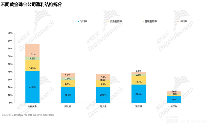 横向对比各品牌一口价产品的经典款,可以看到折合到克重的老铺产品较竞品高出 30% 以上,再加上老铺所有产品全部一口价,远高行业平均水平(当前行业内一口价产品占比普遍不足 20%),因此老铺的盈利能力遥遥领先。