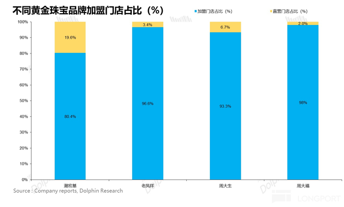 经营模式上,传统的金饰企业普遍采用加盟制,极度依赖渠道铺货。我们耳熟能详的周大福、老凤祥、周大生、潮宏基门店数量均在数千家以上,且 90% 以上的门店均为加盟门店,因此加盟商拿货量的变动对公司业绩影响极大。