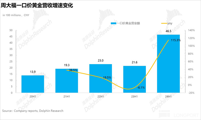 事实上,从去年开始,头部传统金饰品牌均加大了 “一口价” 黄金的品类投入,在营收中的占比均大幅提升,以周大福为例,2024 年上半年 “一口价” 黄金营收同比高增 115%,占比从 4% 提升至 12%。