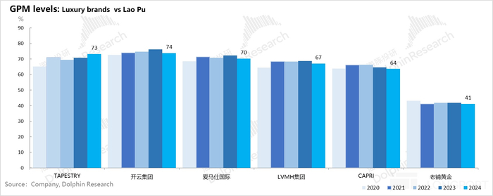 但同时海豚君也注意到,与奢侈品品牌同样开店量、类似单店坪效下,老铺黄金的毛利率距离真正的奢侈品品牌也差距明显。