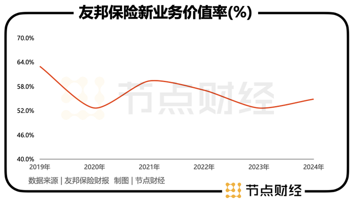 此外,在衡量后续盈利能力的新业务价值率方面,2019年至2024年,分别为62.9%、52.6%、59.3%、57%、52.6%、54.8%,整体呈收敛之势。