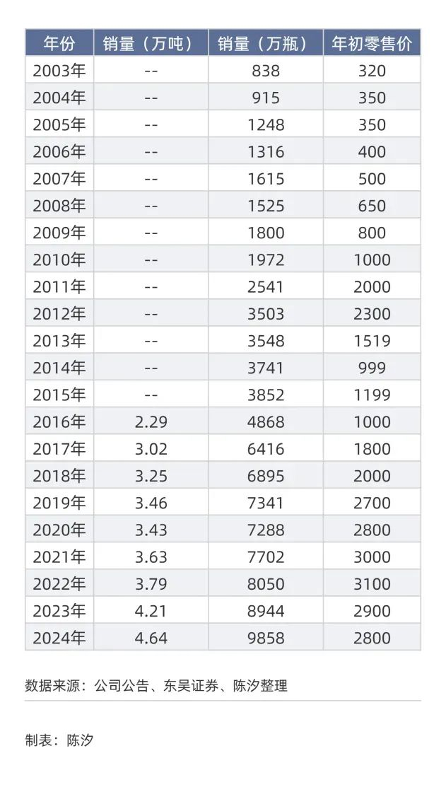 表2:茅台酒历年的销量与终端零售价(2003年-2024年)