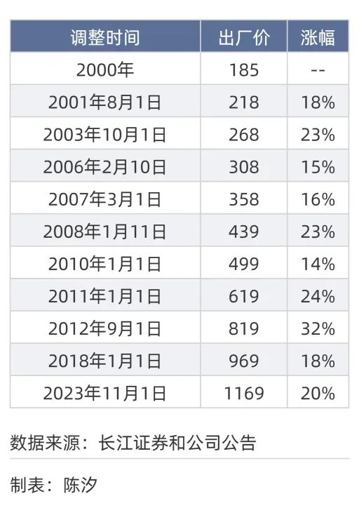 表1: 茅台酒上调出厂价时间表