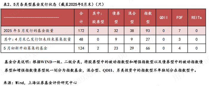 从新发基金类型来看,指数基金是5月基金管理人主要发行的产品类型。5月共发行指数基金66只,发行数量占比为53.23%。
