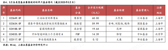 从单只基金来看,5月募集规模前三的基金均为债券型基金,分别为汇安裕宏利率债A(60.00亿元)、国泰中债优选投资级信用债指数A(59.99亿元)和民生加银恒悦(59.90亿元)。