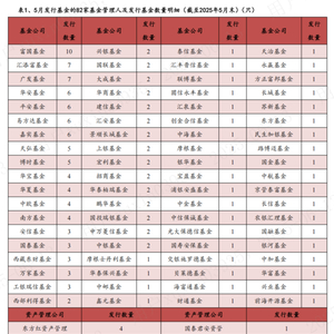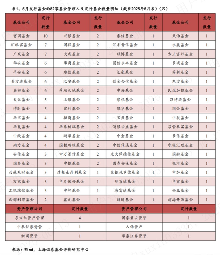 2025年5月参与基金发行的公司数量(82家)与2025年4月(75家)相比有所增加。其中基金公司76家,证券或资产管理公司6家;发行数量最高的为富国基金,本月有10只基金参与发行,连续三月成为发行数量最高的基金管理人。