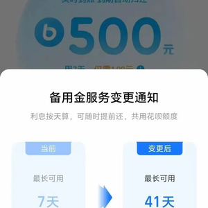 2018年5月,花呗宣布向银行等金融机构开放,扩大资金提供能力。同年6月,花呗上线了期限为7天的500元定额的“备用金”功能,可以提现使用,刚推出时,“备用金”不收利息费用。但2019年,“备用金”升级后,开始向用户收取息费,500元用7天大约需要付息费2.29元或1.99元。