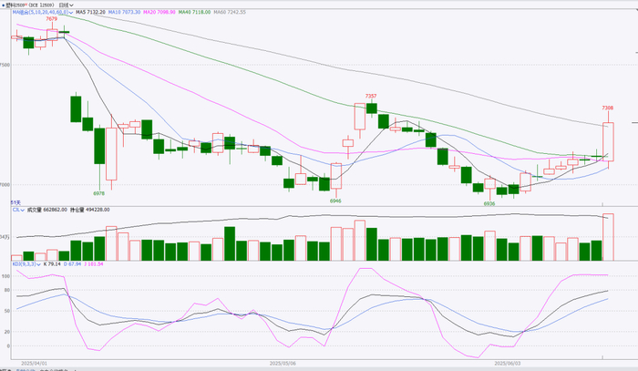 本周塑料主力上涨为主, MACD指标红柱延长, KDJ指标上涨后J线超涨。周K线收大阳线,塑料主力减仓上线,持续推涨动力不足,宏观面不确定性较强, KDJ和MACD指标提示塑料主力支撑较强,但是有下跌风险,上方压力位7411,下方支撑位6936,预计下周塑料主力高位回落。