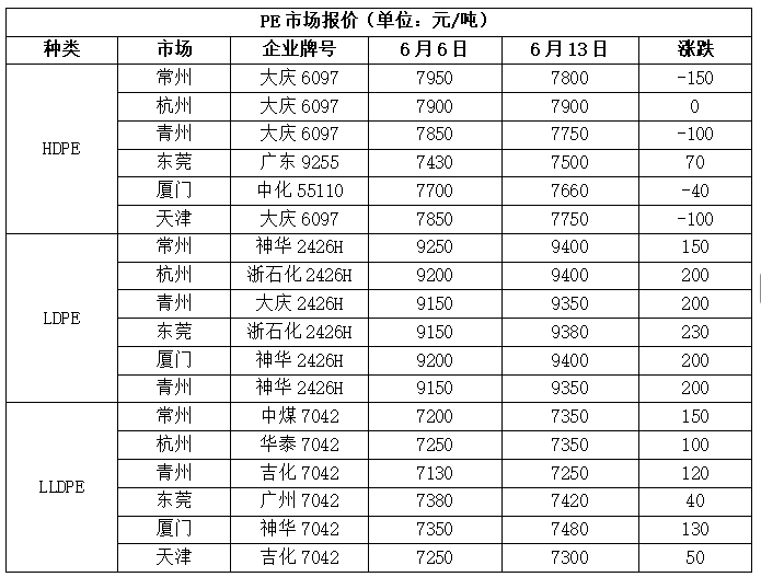 本周聚乙烯市场走势偏强,上涨跌幅在40-230元/吨,LDPE上涨幅度较大,HDPE下跌为主。受中美经贸会谈进展积极影响,市场心态心态持续好转,叠加成本端支撑较强,市场谨慎推涨。供应陆续回归,而标品生产较少,有一定支撑。下游阶段性补库尚可,支撑市场价格推涨,周末地缘冲突加剧,国际原油期货大涨,塑料市场跟涨,但是基差走弱。HDPE供应持续增加,而需求上涨乏力,价格下跌为主。华北市场LLDPE主流7190-7280,LDPE主流9150-9350,HDPE主流7720-7800;华东市场LLDPE主流7250-7550,LDPE主流9300-9480,HDPE主流7650-7850;华南市场LLDPE主流7350-7550,LDPE主流9350-9680,HDPE主流7450-8000。