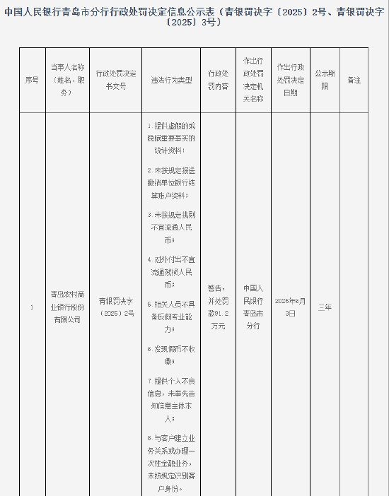 青岛农村商业银行被罚91.2万元:提供虚假的或隐瞒重要事实的统计资料等