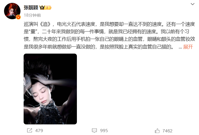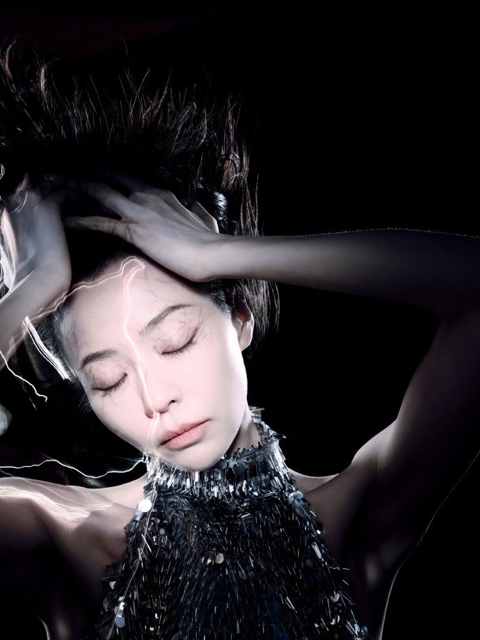 巡演叫《追》,电光火石代表速度,是我想要却一直达不到的速度。还有一个速度是“量”,二十年来我做到的每一件事情,就是我已经拥有的速度。我以前有个习惯,熬完大夜的工作后用手机拍一张自己的眼睛上的血管,眼睛和额头的血管妆效是我很多年前就想做却一直没做的,是按照我脸上真实的血管自己描的。算是我这二十年来努力过的“证据”吧,不然要怎么追到今天的自己。其实,二十年的时间也是一个速度吧,胶原蛋白流失的速度,哈哈哈突然有点庆幸以前脂肪够多……