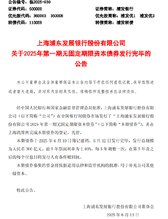 6月13日金融一线消息,浦发银行今日发布公告称,经中国人民银行和国家金融监督管理总局批准,该行在全国银行间债券市场发行了“上海浦东发展银行股份有限公司2025年第一期无固定期限资本债券”(以下简称“本期债券”),并在上海清算所完成本期债券的登记、托管。